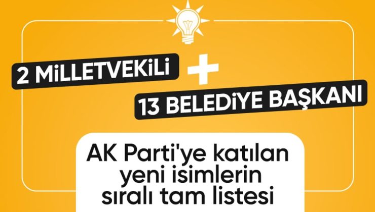 Bir tanesi İyi Parti’den, 7’si Yeniden Refah Partisi’nden, 5’i ise bağımsız olmak üzere toplam 13 belediye başkanı da AK Parti’ye katıldı.