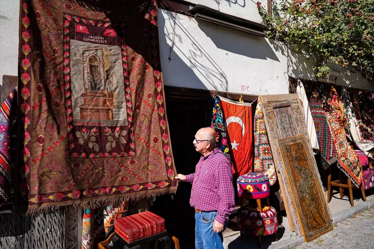 Başkentte geleneksel halı ve kilim dokumacılığı yapan Ahmet Geyiklioğlu, 25 yıldır her 29 Ekim’de “Cumhuriyet” adını verdiği özel kilimi dükkanında sergiliyor.