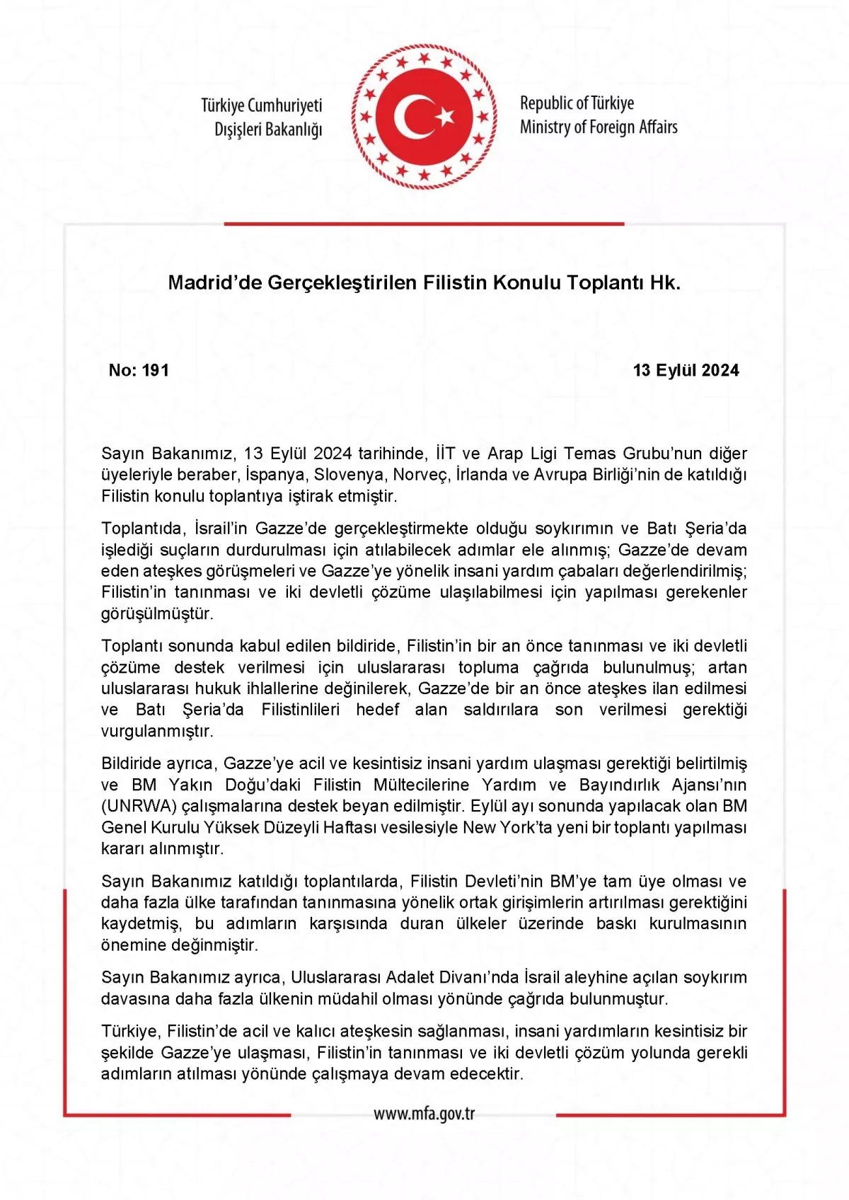 Dışişleri Bakanlığı sosyal medya hesabından yapılan açıklamada, Bakan Fidan’ın, 13 Eylül 2024 tarihinde, İİT ve Arap Ligi Temas Grubu’nun diğer üyeleriyle beraber, İspanya, Slovenya, Norveç, İrlanda ve Avrupa Birliği’nin de katıldığı Filistin konulu toplantıya katıldığını açıkladı. Dışişleri Bakanlığı’ndan yapılan yazılı açıklamada, Toplantıda, ” İsrail’in Gazze’de gerçekleştirmekte olduğu soykırımın ve Batı Şeria’da işlediği suçların durdurulması için atılabilecek adımlar ele alınmış; Gazze’de devam eden ateşkes görüşmeleri ve Gazze’ye yönelik insani yardım çabaları değerlendirilmiş; Filistin’in tanınması ve iki devletli çözüme ulaşılabilmesi için yapılması gerekenler görüşülmüştür.”