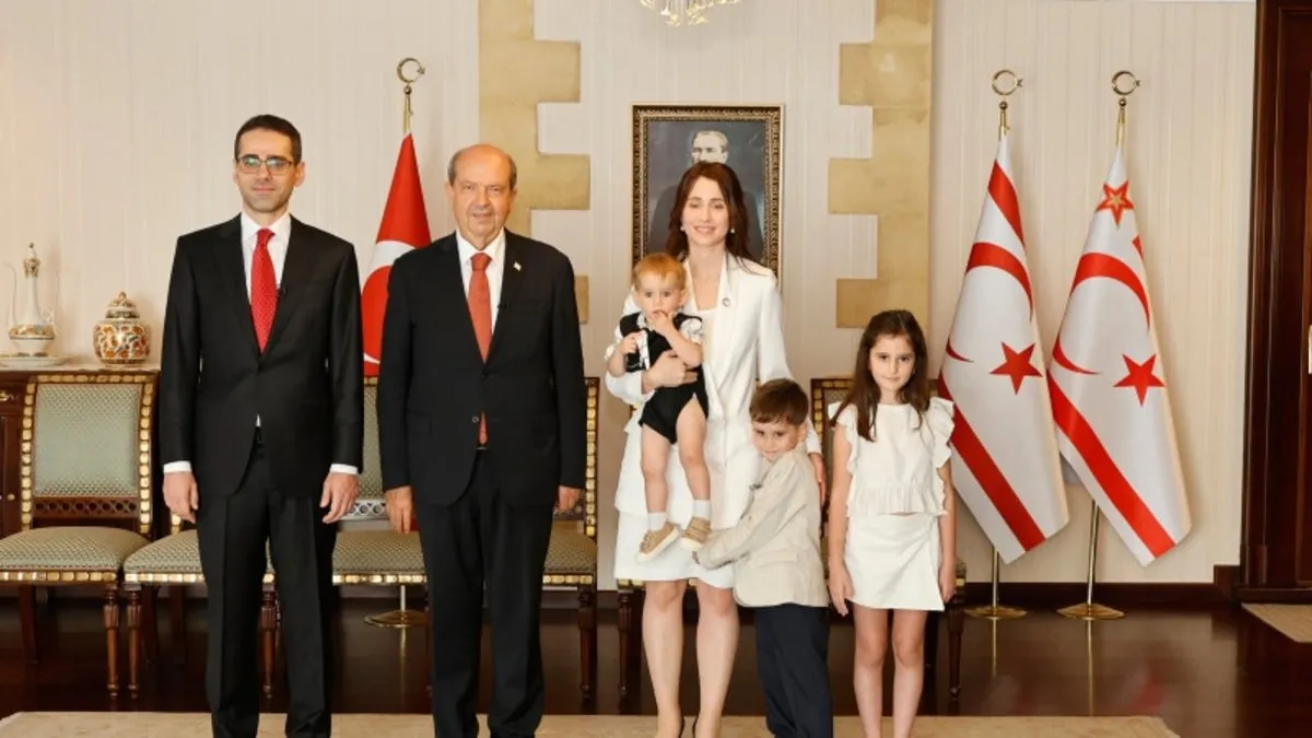 Cumhurbaşkanı Ersin Tatar, Serim ailesini makamında son derece sıcak bir şekilde karşılarken, Serim çiftinin çocuklarına özel ilgi gösterdi; ailenin en küçük oğlunu kucağına alarak onunla samimi bir fotoğraf çekildi.