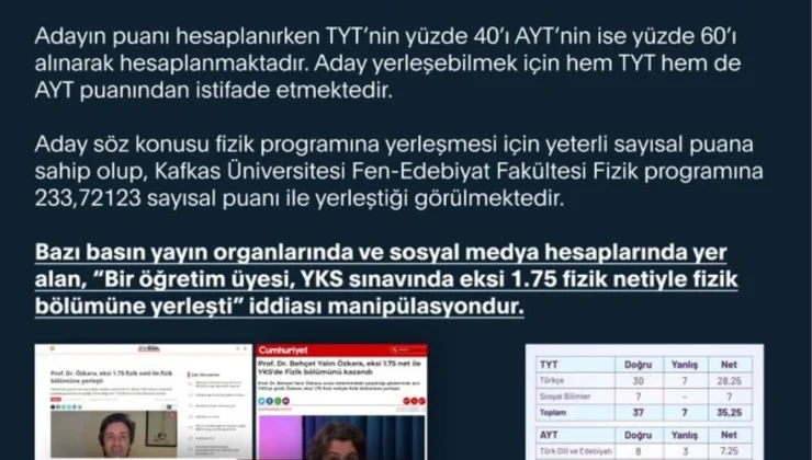 Öte yandan, konuyla ilgili Dezenformasyonla Mücadele Merkezi’nden yapılan açıklamada, “Bazı basın yayın organlarında ve sosyal medya hesaplarında yer alan, ‘Bir öğretim üyesi, YKS sınavında eksi 1.75 fizik netiyle fizik bölümüne yerleşti’ iddiası manipülasyondur” denildi.